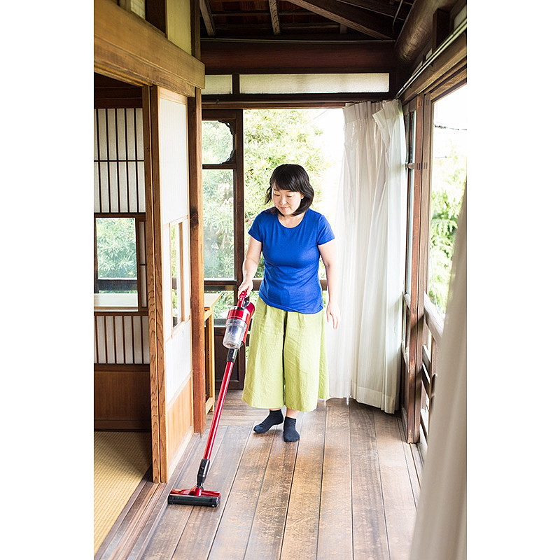 掃除自体は、とにかく軽いのでやりやすい! あまりの軽さに、思わずつんのめりそうになるほどです。この軽さで、しかもコードレス式となれば、いつでもササッと掃除ができます。これは、冒頭で触れた「掃除=面倒くさい」というイメージを取り除くこと間違いなし。実際、階段の掃除などは非常に重宝します。