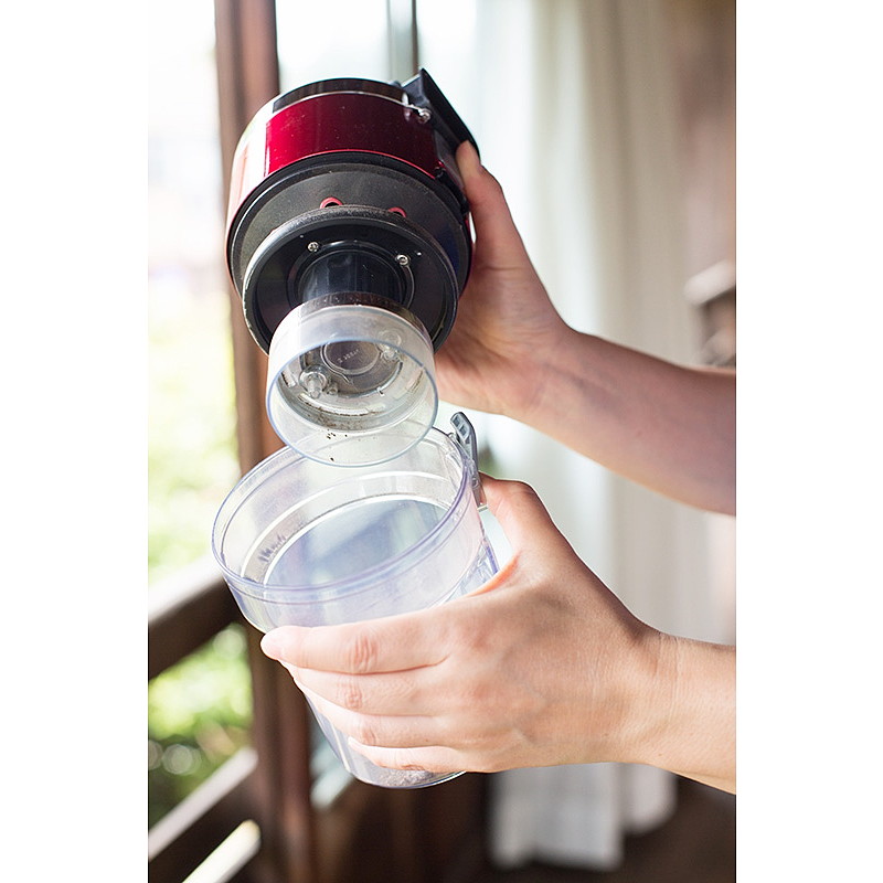 では、吸い取ったゴミはどうようになっているのでしょうか? まず、ゴミを捨てる時は、本体からダストカップを外します。次にダストカップカバーを外します。すると、小さく圧縮されたゴミにびっくり! えっ!? たったこれだけしかないの?と驚いてしまいました。しかも、ホコリは舞い上がることなく、小さなゴミの固まりをゴミ箱にポイッと捨てるだけ。ゴミが溜まっても、紙パック式の掃除機のようにパックを取り替える必要もありません。また、ダストカップが透明なので、ゴミの量を確認しながら掃除ができるのもヨシ。