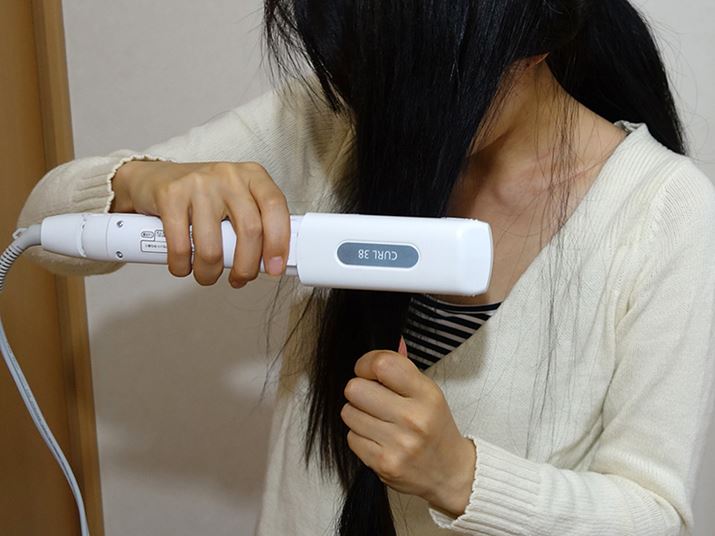 とはいえ、説明書を読みつつ何度か試行錯誤していると、だんだんコツがわかってきました。特に重要なのは、最後にグッと髪を巻き込むこと、そしてゆっくりアイロンを滑らせること。また、滑らせるときに本体に角度をつけるのもポイントのようです。慣れれば「なぜ最初はできなかったんだろう?」と感じます。一度コツを覚えれば、かなり早く作業ができ、ロングヘアーの筆者でも、全体の髪を巻くのにだいたい12分程度。使い慣れれば、もう少しスピードアップしそうです。