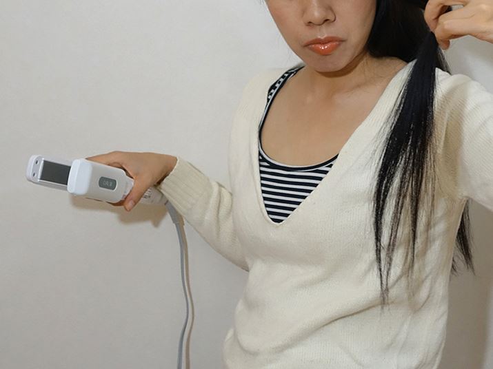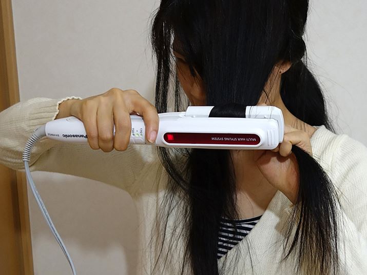 EH-HW53は「滑らせるタイプ」のヘアアイロン。滑らせるタイプのヘアアイロンは、髪を挟んで本体を半周から1周回転させ、あとは下に滑らせるだけです。ところが、説明書だと簡単そうなのですが、最初の1回目に出来上がったのは、完全なるストレート。“誰でも簡単”というわけではなさそうです。使いやすさから言えば、グルグルと本体に巻き付けて、数秒待つだけの「巻き付けるタイプ」のほうが、アイロン初心者には簡単かもしれません。