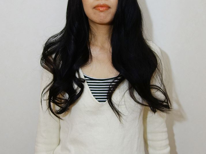 髪全体をカールさせたところ。ストレートよりもボリュームがあり、華やかな印象に。かなりイメージが変わります