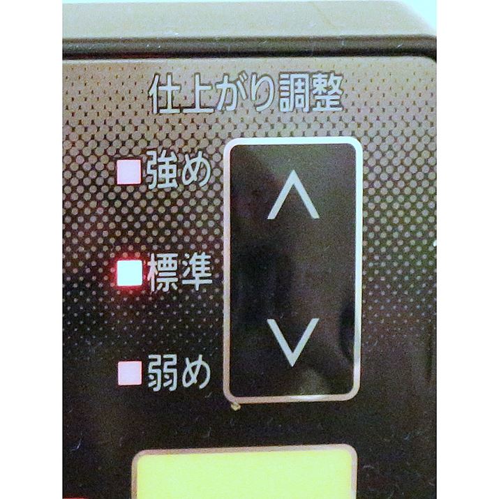 加熱の強さを調節したい時は、「仕上がり調節」ボタンで設定。「強め」「標準」「弱め」を選ぶことができ、初期設定は「標準」になっている。調理開始後2分以内(ランプ点滅中)であれば、調節し直すことも可能