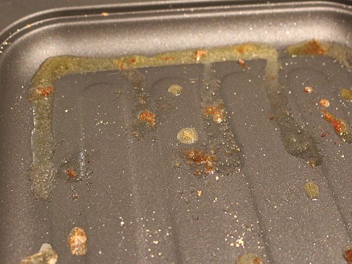 それもそのはず、調理後の「フライ用受け皿」には、余分な脂がたっぷりと落ちている。これだけ脂が落ちていても、噛むと肉汁があふれた。高速熱風がすばやく外側を加熱することで、肉汁が閉じ込められているのかもしれない