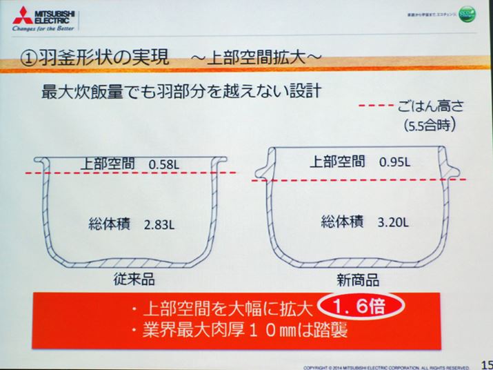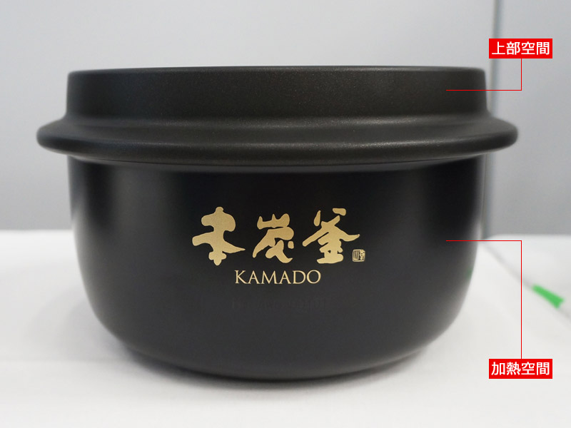 従来は最大炊飯量を炊くと上部空間に0.58Lしか空きがなかったが、「本炭釜 KAMADO」では0.95Lも余裕ができた。総体積も約13%大きくなっており、大火力でも吹きこぼさずに炊飯できる