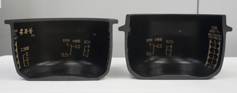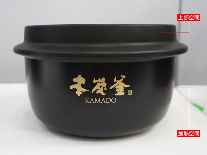 炊飯器の内釜にも羽を備えるものもあるが、羽が内釜をセットする部分(かまど内)に収まってしまったり、最大炊飯量を炊くとごはんが羽を越えてしまうものが多々。これでは上部空間と加熱空間の温度差が小さくなり、狭い上部空間では吹きこぼれ抑制力が働きにくい。ゆえに炊飯器の場合、火力を弱めることで吹きこぼれを防止。つまり、激しい沸騰を維持することができない状態であった。「本炭釜 KAMADO」は内釜を羽釜形状にするとともに、かまど同様に上部空間がはみ出る構造を採用。さらに、従来モデルよりも上部空間を約63%拡大したことで、吹きこぼれを抑えながら連続沸騰できるようにした。