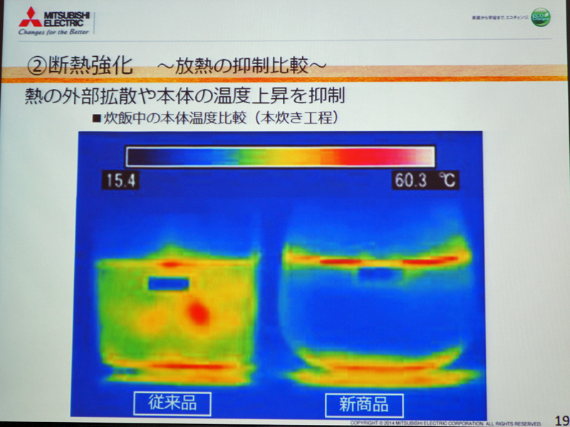 従来モデルと炊飯中の本体温度を比較すると、「本炭釜 KAMADO」のほうがあきらかに低い。熱が外部拡散していないことがわかる