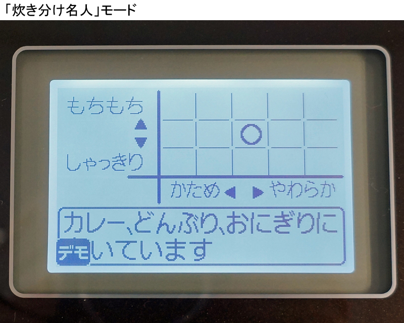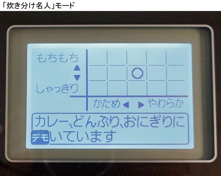 「炊き分け名人」モードは、水加減なしで硬さや粘りを炊き分けできる。選択した食感が、どんなメニューに適しているかが表示されるのも便利