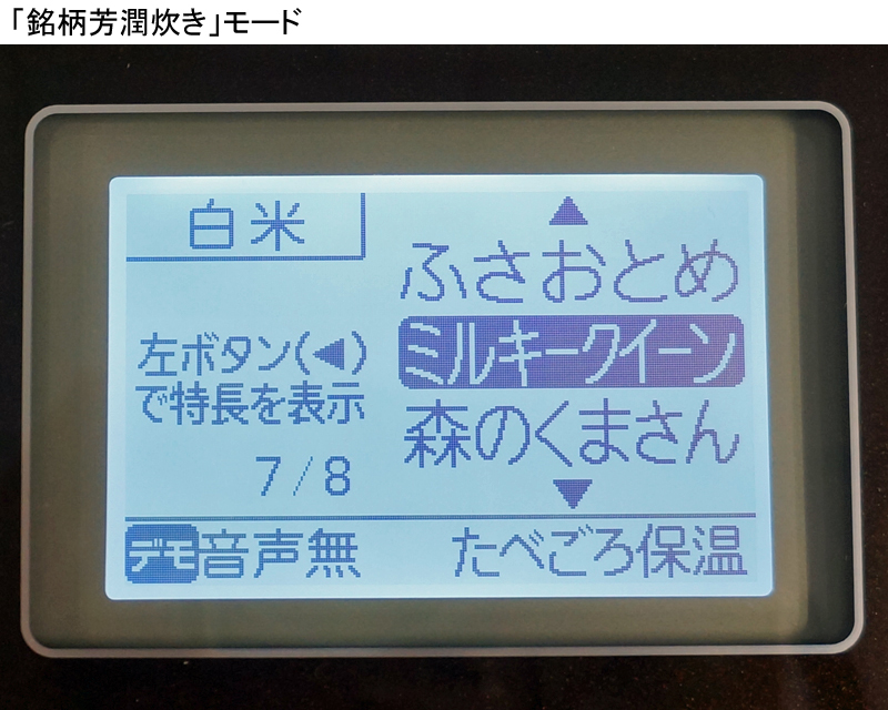 米は銘柄によって吸水率などが異なるため、米の持ち味を引き出すためには個々に適した炊飯を行わねばならない。しかし、いちいち設定するのは面倒。そんな手間を解消してくれるのが「銘柄芳潤炊き」モードだ。銘柄を選べば、あとは炊飯器が最適な炊飯を行ってくれる。また、銘柄は指定せずに食感や粘りを細かく選びたい際に利用できる「炊き分け名人」モードも搭載。