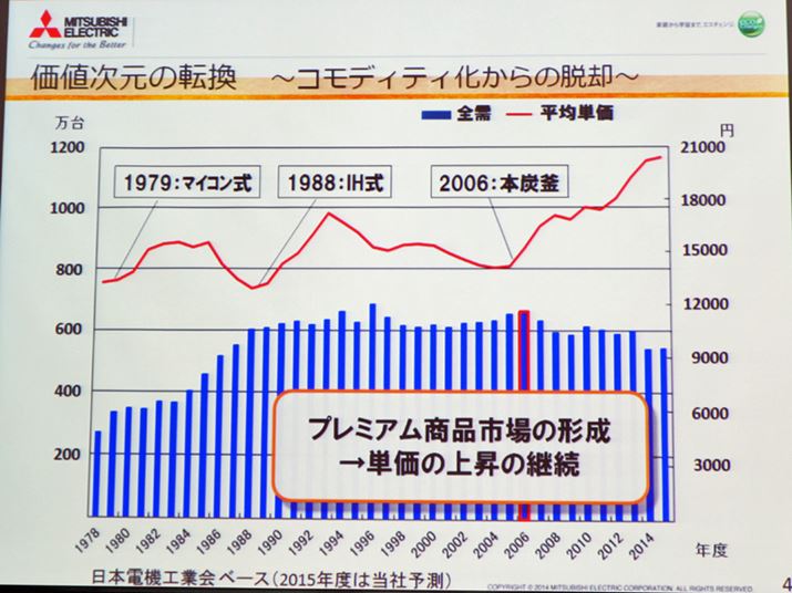 「本炭釜」が誕生した2006年以降、炊飯器の単価は上昇。内食志向や食へのこだわりを持つ人は年々増えており、同社は炊飯器の出荷台数における高級クラスの構成比が10年前の約13%から2015年度には30%強になると予測している