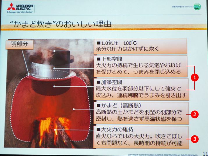 かまど炊きがおいしい理由の1つに“1.0気圧で炊く”が挙げられている。これは、圧力をかけずに炊くということ。「本炭釜」は圧力式ではないので、この要素はクリアしている。@〜Bについては以降で解説