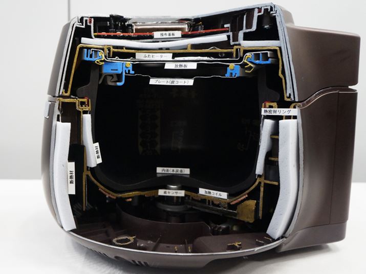 IH炊飯器の内釜は内釜自体が発熱するとは言え、効率的に高温を維持するためには熱を逃がさないことも重要だ。「本炭釜 KAMADO」は、従来から搭載されていた3mmの断熱材のほかに10mmの断熱材を追加した。さらに、かまどが羽部分で熱を漏らさないようにしている構造にならい、内釜の羽が触れる部分にも断熱のための工夫を施した。