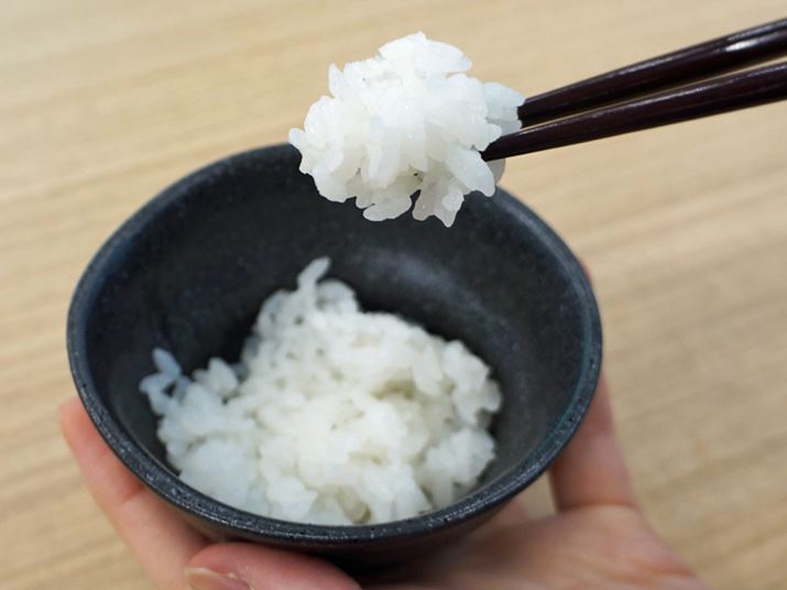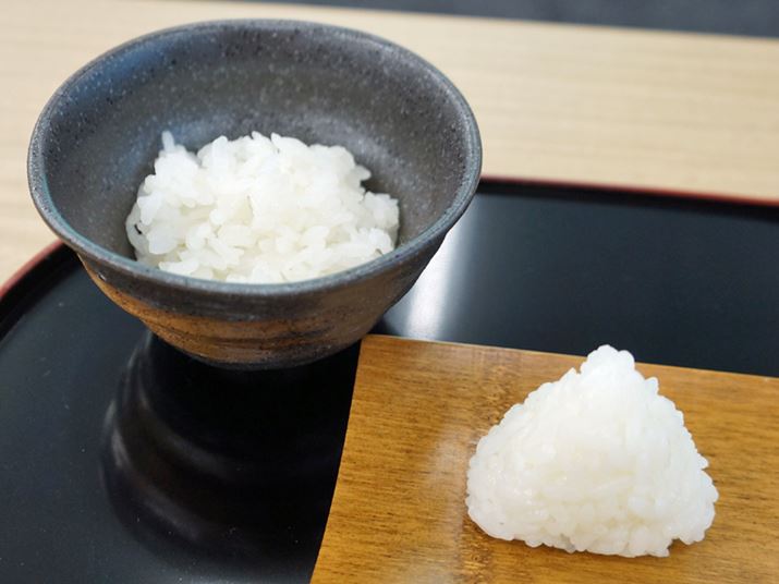 お茶碗に盛られたごはんは炊きたてホカホカ状態ではなかったが、1粒1粒がしっかり膨らみ、艶やか。ハリがあるので、喉越しや食感はバツグンだ。甘みもしっかりと出ており、みずみずしさも十分。おにぎりのほうも口に入れると軽くほどけ、冷めるとより甘みが増すように感じた