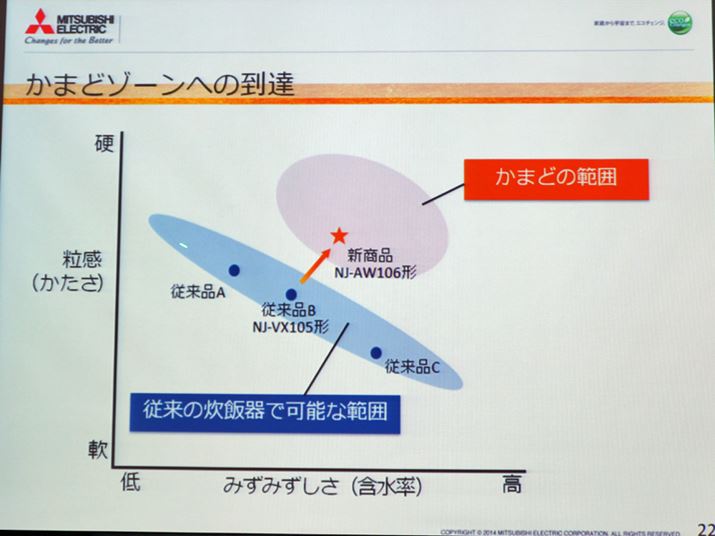 一般的に炊飯器では、ごはんの粘りを重視すると食感が柔らかくなり、硬めの食感を優先するとパサついたごはんになりやすい。かまどで炊くと、この相反する粒感とみずみずしさをバランスよく両立することができる。つまり、かまどを再現した「本炭釜 KAMADO」なら、かまどごはんと同様の味わいを楽しめるという