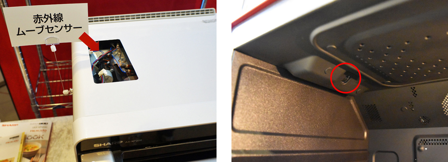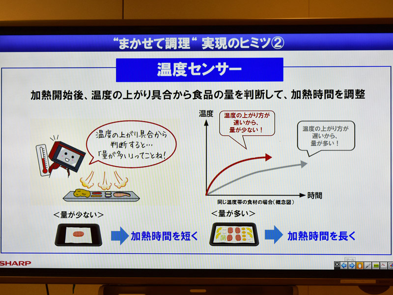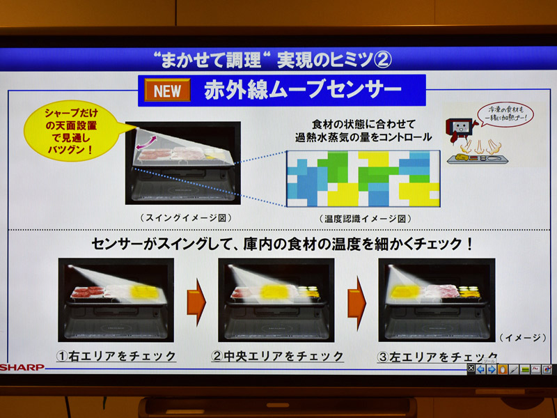 上で紹介した過熱水蒸気の特性は、これまでも「ヘルシオ」では作用していたこと。しかし、それだけでは冷凍・冷蔵・常温の食材を一度にムラなく仕上げることは難しい。そこで「AX-XP200」では、「赤外線ムーブセンサー」と「温度センサー」を用いて制御することに。まず最初に「赤外線ムーブセンサー」で食材の温度をセンシングし、状態にあわせた量の過熱水蒸気を放出。加熱が始まってからは、「温度センサー」が庫内の温度上昇具合から食材の量を判断して加熱時間を調整する。