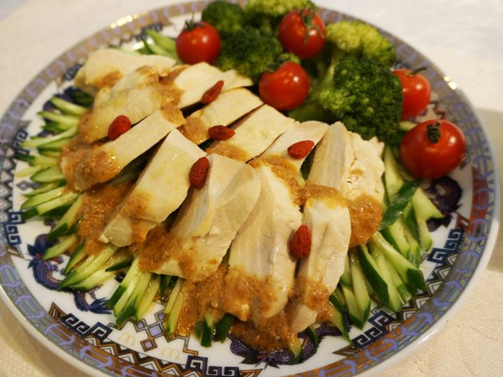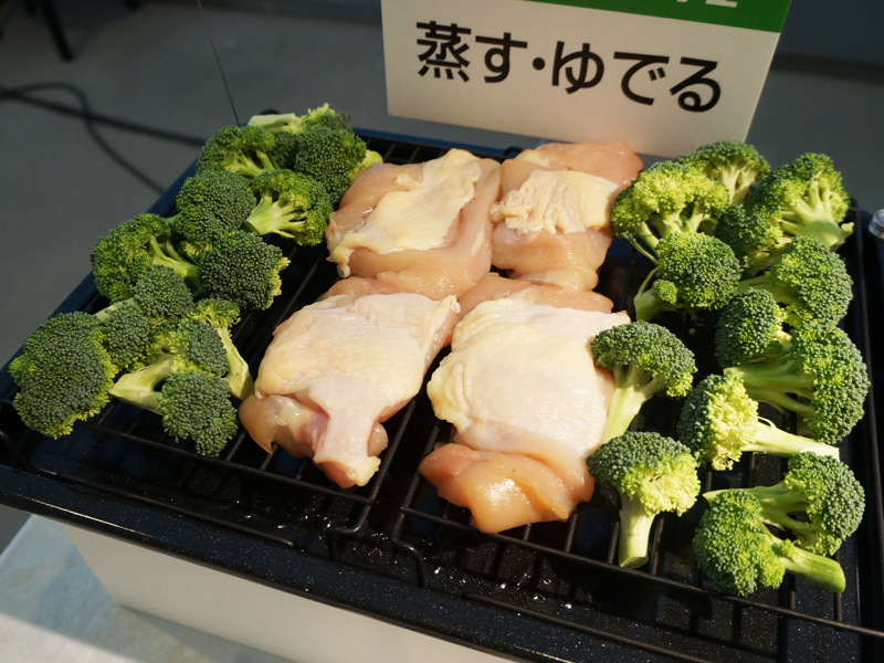 鶏肉とブロッコリーを並べて調理すれば、バンバンジーが簡単に作れる。できあがりを見ると、ブロッコリーは色鮮やかで、鶏肉もジューシーさが損なわれていないようだ。