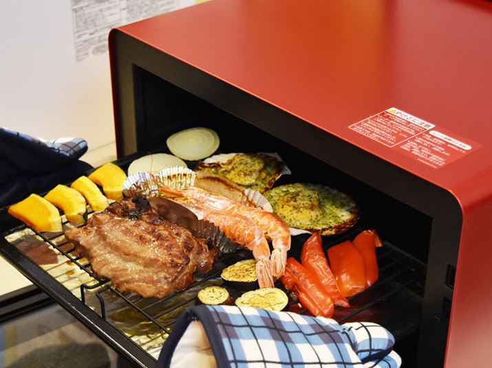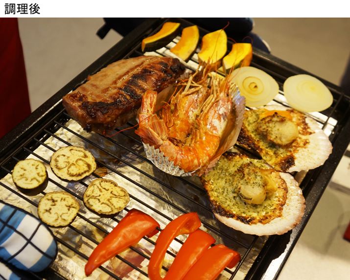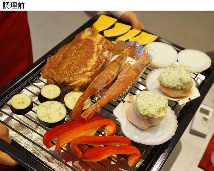 他社製品でも、冷凍や冷蔵を指定せずに自動で状態を見分けて調理してくれる機能はあるが、「まかせて調理」のように混合して調理することはできない。画期的な調理方法だが、実際の仕上がりは満足できるレベルなのだろうか。今回、会場で調理されたのは、冷蔵の牛肉とホタテ、冷凍のエビ、常温の野菜類を並べて焼き上げる「ミックスグリル」。冷凍庫から出したばかりのエビはカチカチで、牛肉の塊はかなり分厚い。