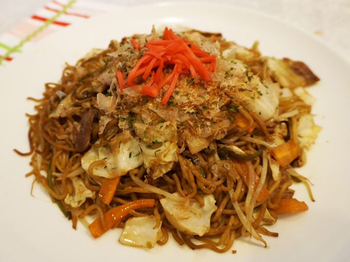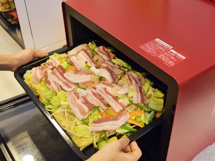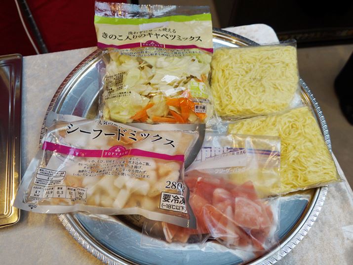 市販のミックス野菜と麺、冷凍のシーフードミックス、そして自宅で小分けして冷凍しておいた豚肉をトレイに並べる。写真ではかかっていないが、ソースは調理前に食材にかけておくそう。加熱終了後に、麺や具材を混ぜれば焼きそばが完成する。