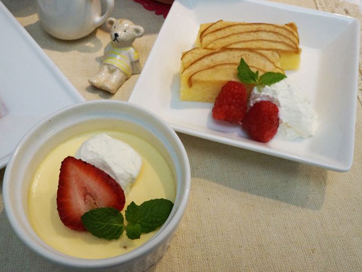 ケーキとプリンも同時進行でできあがる。スイーツの組み合わせは16とおり用意