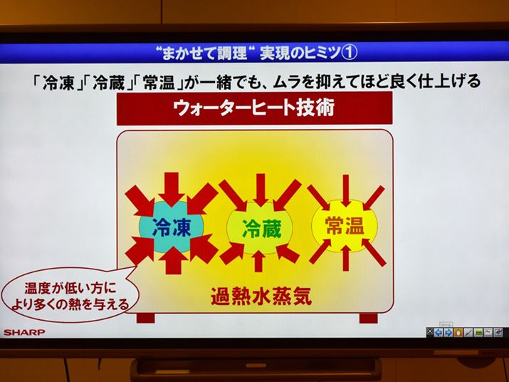 過熱水蒸気は、温度の低いほうに多くの熱を与える特性を持っている。この特性を利用することで、冷凍・冷蔵・常温といった異なる状態の食材を一度に仕上げられるという。他の加熱方法を併用せず“最初から最後まで水(過熱水蒸気)で焼く”「ウォーターヒート技術」を採用する「ヘルシオ」だからこそできるワザだ。