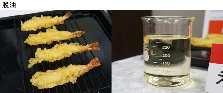 エビの天ぷらを「ヘルシオ」で温めると、適度に油が落ち1尾あたり約12kcalOFFに(筆者算出)。1回の脱油は少なく感じるが、1週間に1回エビの天ぷらを4尾食べた場合、1年で約300cc(カロリーにすると約2300kcal相当)の油がカットできる