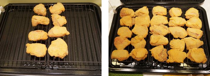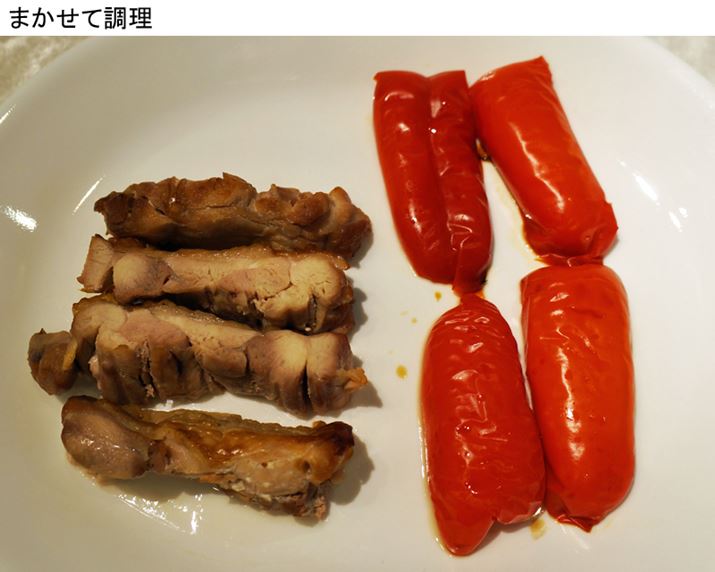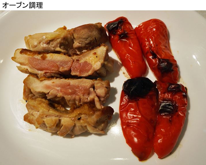 オーブン調理のほうはパプリカが炭化しており、鶏肉は中が生っぽい。いっぽう「まかせて調理」で作ったものは、どちらもベストな仕上がりだ。