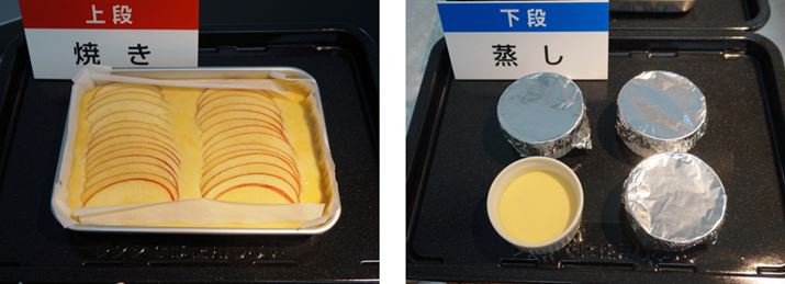 上段で“焼き”、下段で“蒸し”の異なる加熱を行うことで、魚などの焼き物料理と茶碗蒸しなどの蒸し物料理が同タイミングで作れる「焼き・蒸し同時メニュー」がスイーツにも対応した。