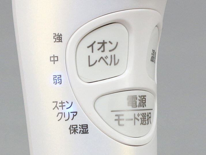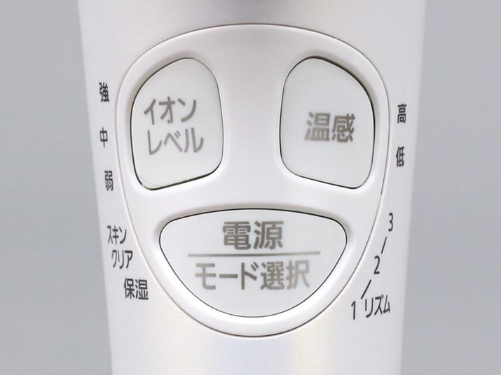 操作スイッチは、運転モードの切り替えを行う「電源/モード選択」、イオンの強さ(強/中/弱)を調整する「イオンレベル」、温感の高(47℃)/低(40℃)/オフを選択する「温感」の3つ