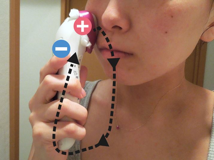 ヘッドが肌に触れている部分がプラスの電位を持ち、肌の内側がマイナスの電位を持っているため、写真のように微弱電流が流れます。この流れは肌表面から角質層へ向かっており、この流れに乗って化粧品の保湿成分も一緒に移動するため、角質層への浸透力がアップするのだとか