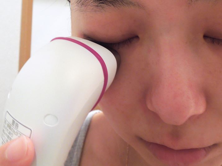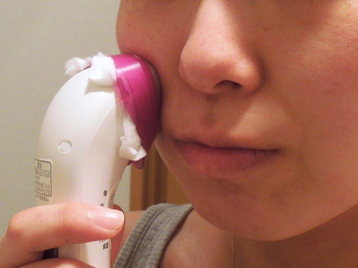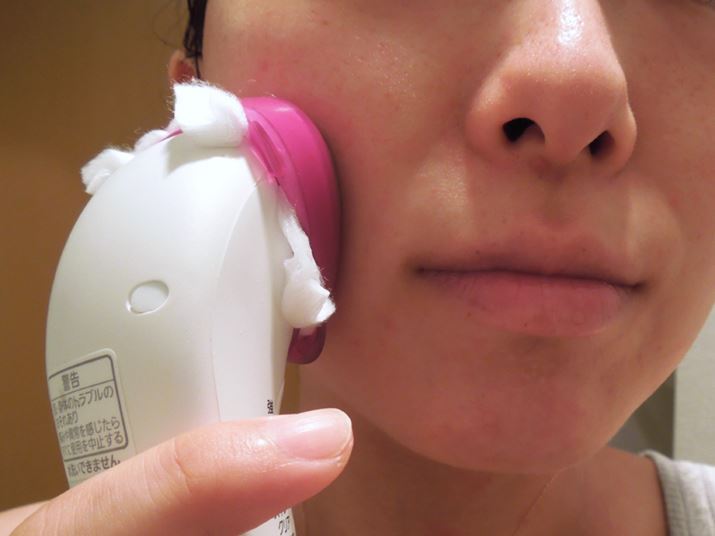 肌に当てると、温かなヘッドから「ブー、ブー」という振動が伝わってきます。あご→ほお→Tゾーンと、顔の下から上にコットンをまんべんなく当てていきましょう