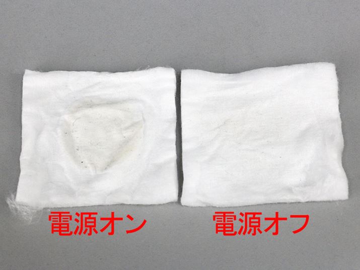 顔の半分をEH-ST51の電源をON(スキンクリアモード)にして使用、半分を電源OFFで使用し、「スキンクリアモード」の効果を検証! 電源をONで使用したコットン(写真左)には汚れが付いているのがはっきりと確認できますが、電源OFFの状態で使用したコットン(写真右)は、ほとんど汚れていません。毎日「スキンクリア」を使用すれば、肌に透明感が出てきそうです