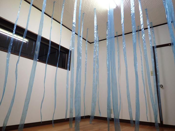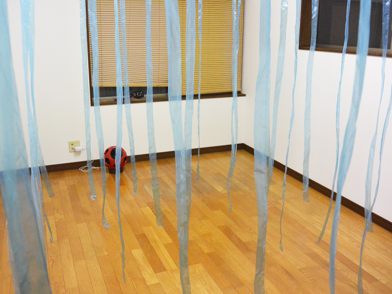 どのように風が届くのかを、6畳の部屋で調べてみる。「Q」の吹出口より90cm離れた所からビニールテープを垂らし、約60cm間隔で部屋の奥まで配置。横に垂らしたテープは、中央部を除いて約30cm間隔とした(中央部分のみ電気があるため、約60cmの開き)。風量を1〜5に順に変えていき、最後に「1/fゆらぎ」を実行して風の動きをチェックする。