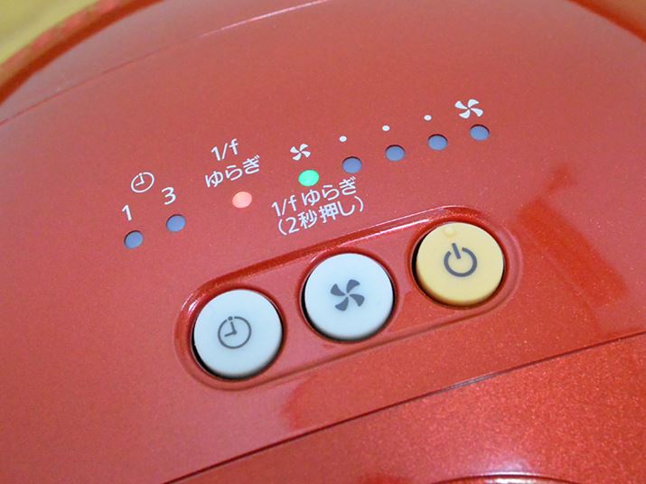 コントロールできるのは電源のON/OFFと風量、「切」タイマー(1時間と3時間)のみ。風量は5段階から選べるほか、信州・蓼科高原に吹く風をプログラムした「1/fゆらぎ」というモードも用意されている。リモコンは付属していないので、すべて操作部で行う