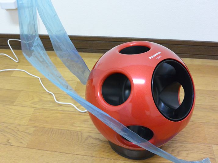 風量「1」では「Q」の正面にあるビニールテープが揺れる程度だが、「2」になると奥のほうまで風が届いてる(上の動画参照)。「3」にすると正面だけでなく、部屋全体のテープが揺らぎ、「4」で天井付近までなびいた。風量「5」になると、「Q」と一番離れた所のテープも勢いよく揺れている。最後に実施した「1/fゆらぎ」は風量「5」の状態で試したが、大風量と微風が切り替わりながら送風された。