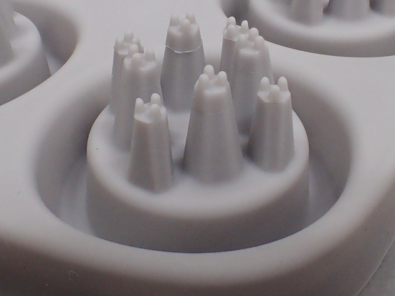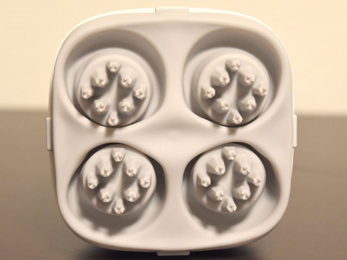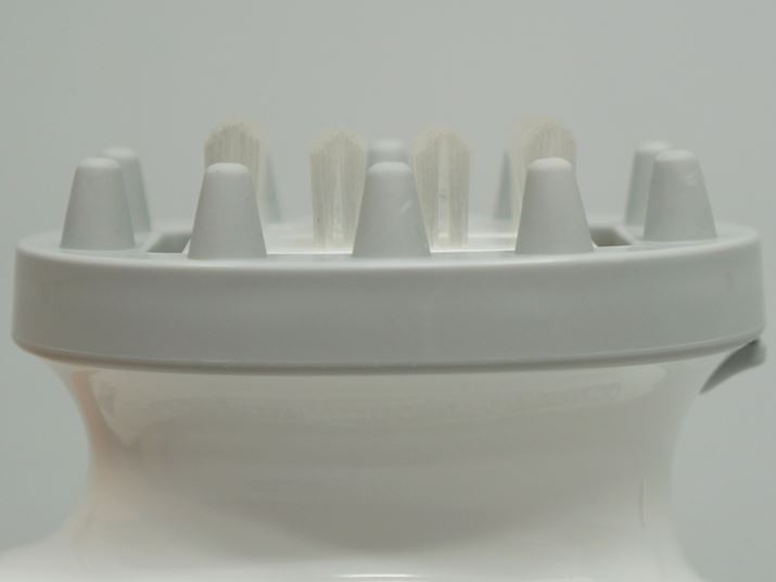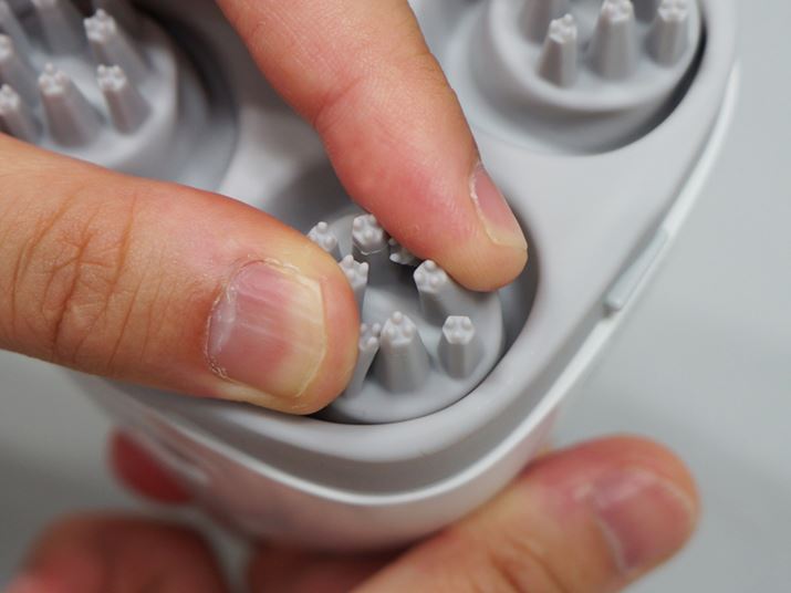 2つのパーツに分かれたブラシ(白い部分)が、互いに逆方向に動く。ブラシは頭皮に届きやすいように山切りカットされており、中央に向けて低くなるように配置することで頭部にフィットしやすくしている。ちなみに、ブラシを囲むようにあるグレーの突起は過度な押しつけを防ぐための施策。ツボ押し効果を発揮するものだと思ったが、違ったようだ……