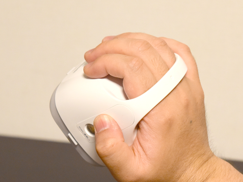 サイズは、8.9(幅)×11.5(高さ)×8.9(奥行)cm。「音波頭皮ブラシ」とは異なり、指を通すためのアーチが装備されている。充電に必要な時間は、「音波頭皮ブラシ」と同様に約1時間