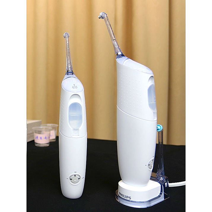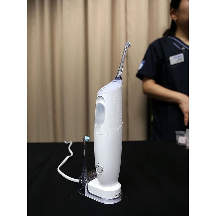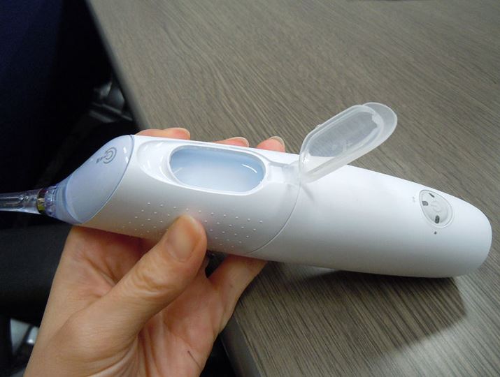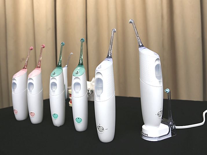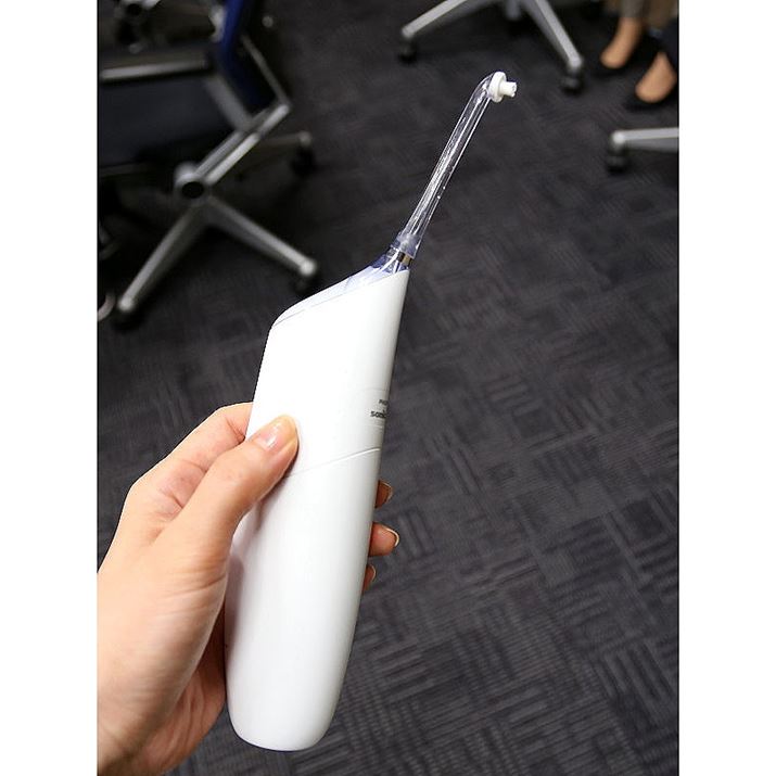 「ソニッケアー エアーフロス」シリーズは、歯間にノズルの先端をあて、加圧された空気でミクロの水滴を噴射して洗浄するという仕組み