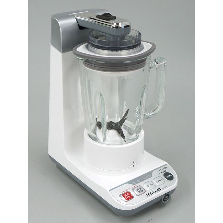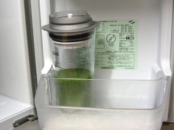 TMV1100で作ったスムージー(写真左の左)と、一般的なミキサーで作ったスムージー(写真左の右)を比較すると、TMV1100では明らかに泡立ちが抑えられています。作ったジュースを真空保存しておけるのは、1人暮らしや、スムージーを飲む時間がばらばらなファミリーにも便利