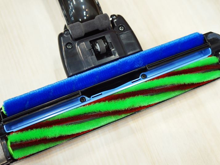 新ヘッドのポイントは2つある。まず1つ目は、ヘッド裏に配置された大きな吸込口。この部分が高気密になることで高速風が発生し、ゴミを勢いよく前後から吸引する。しかし、これだけでは操作性に問題が生じてしまう。床面に密着すれば微細じんまで取りやすくなるが、圧力によりヘッドが動かしづらくなってしまうからだ。“気密性を高めたまま、動かしやすい”という相反する状態を両立するために用意されたのが、2つ目のポイントとなるヘッド上部に設けられた空気の取り入れ口。上部から引き込まれた空気の流れが、ゴミなどを吸引する高速風にぶつかることで床面とヘッドの貼りつきを抑える。