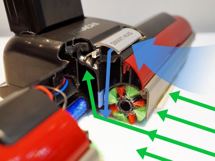 2つの空気の流れを視覚化しすると、ゴミを掃除機に吸い込むための高速風は緑の矢印、床面に吹きつけられる風は青い矢印となる。ヘッド上部から流れる風(青い矢印)は、フローリングなどの目地にあるゴミを浮かせる効果もあるという