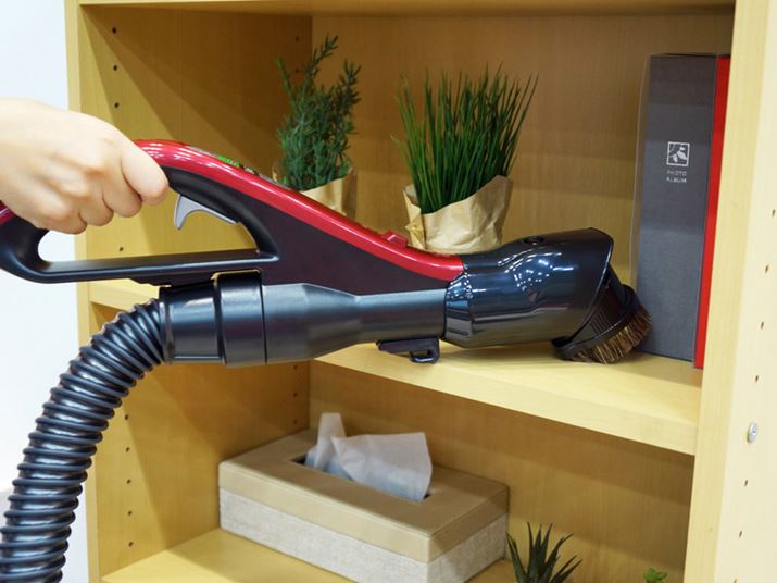 掃除機に装着しておける「クルッとブラシ」や、付属のノズルを利用すれば高所から細い所までしっかり掃除できる。