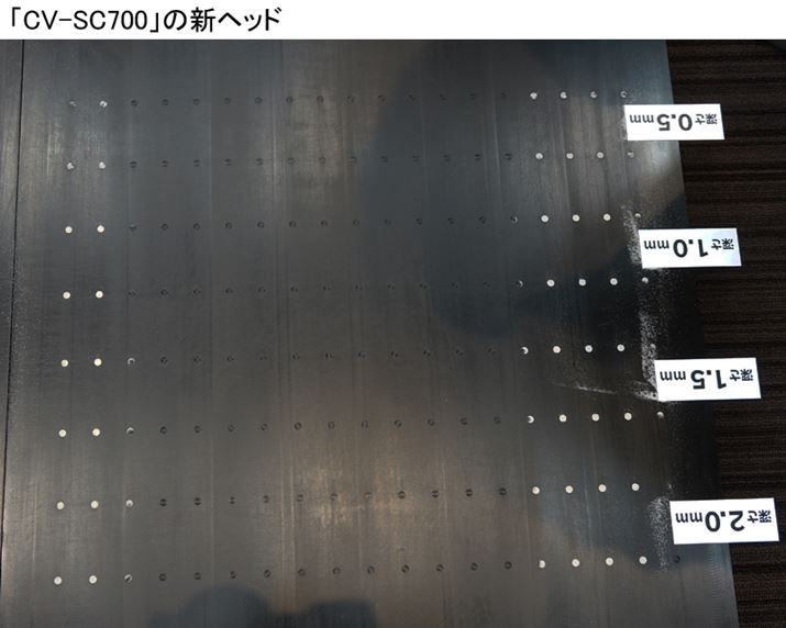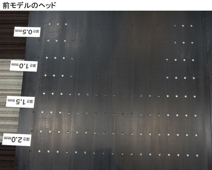 従来ヘッドでも0.5mmと1mmの深さの小麦粉は除去できているが、1.5mm以上の深さになると取り残しが目立つ。いっぽう、新ヘッドのほうは1粒もないとまでは言い切れないが、2mmの穴の小麦粉もほとんど取り除かれている。従来ヘッドよりも、高い精度で掃除できることが証明された。