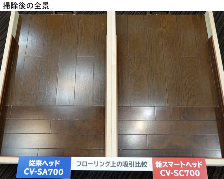 上の動画で披露された新ヘッドの実力を、会場で実践。従来ヘッドを搭載した前モデル「CV-SA700」と新ヘッド装備の「CV-SC700」で、「穴に詰まった小麦粉の掃除」「フローリング掃除」「カーペット掃除」を行い、ゴミの取れ具合に差が出るかを検証する。