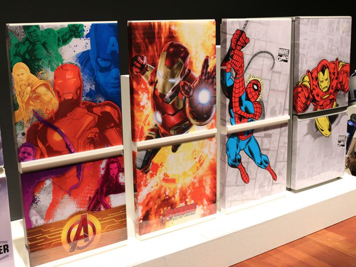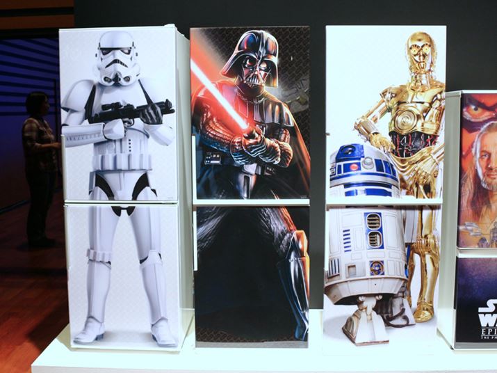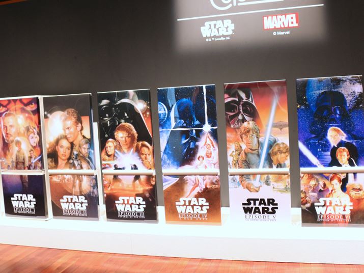 「スター・ウォーズ」エピソード1から6までをデザインしたシリーズ(写真中)と同シリーズのキャラクターを描いたシリーズ。そのほか、「MARVEL」のスパイダーマン、アイアンマンなどをデザインしたシリーズもラインアップされた。正面から見ると、まるで大きなポスターを貼っているようだ