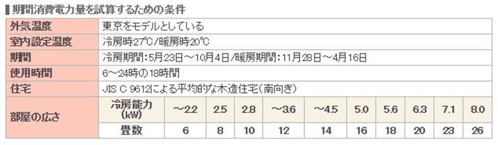 期間消費電力量の計測方法は社会環境にあわせて見直しされており、近々では2013年に改正。「JIS C 9612:2013」という表記があれば、改正後の条件で試算された数値となる。そのため、それ以前のエアコンの期間消費電力量とはイコールで比べることはできないが、改正前の「JIS C9612:2005」で試算された期間消費電力量が併記されていることも多い。2005年度モデル以降からの買い替えならば、どのぐらい省エネになるのかを比べることも容易にできる