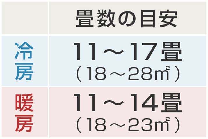 冷房と暖房では適用畳数が異なる。暖房のほうが小さいので、暖房運転も利用するなら、暖房のほうの畳数もチェックし忘れないようにしよう