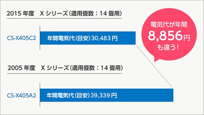 10年前に購入したエアコンを最新モデルに買い替えると、どのぐらい省エネになるのか調査してみよう。今回比べたのは、パナソニックのXシリーズ。2005年発売「CS-X405A2」と2015年度モデル「CS-X405C2」を「JIS C9612:2005」による期間消費電力量をもとに比較したところ、8,856円も年間電気代に差が出た(2005年度モデル:1,457kWh、2015年度モデル:1,129kWh)