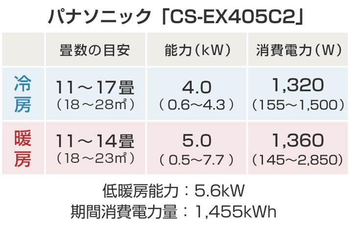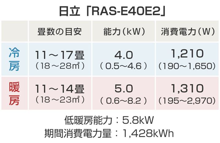 また、暖房を使用することが多い場合は「低暖房能力」も確認しておこう。冷房と対になって表に記されている「暖房能力」は“室内20℃、室外7℃”の条件で試算されているが、もっと気温の低い時期の性能を知る指針として “室内20℃ 、室外2℃”で算出した低暖房能力が併記されている。冬に使うメインの暖房器具がエアコンならば、低暖房能力の高いものをセレクトしておきたい。