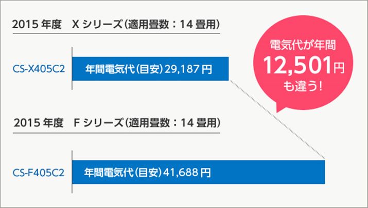 パナソニックの上位モデル「Xシリーズ CS-X405C2」と下位モデル「Fシリーズ CS-F405C2」を比較した結果。価格.comでの本体価格の最安値が「CS-X405C2」が179,000円で「CS-F405C2」が102,000円となっており、差額は77,000円となる(2015年7月7日時点)。電気代に換算すると、年間電気代は「CS-X405C2」のほうが12,501円安い。つまり、6年強利用すれば、購入時の差額もランニングコストの浮いた金額で補えることになる ※年間電気代(目安)は、「JIS C 9612:2013」の期間消費電力量をもとに算出したものです(1kWhあたりの電力量料金は27円で算出)