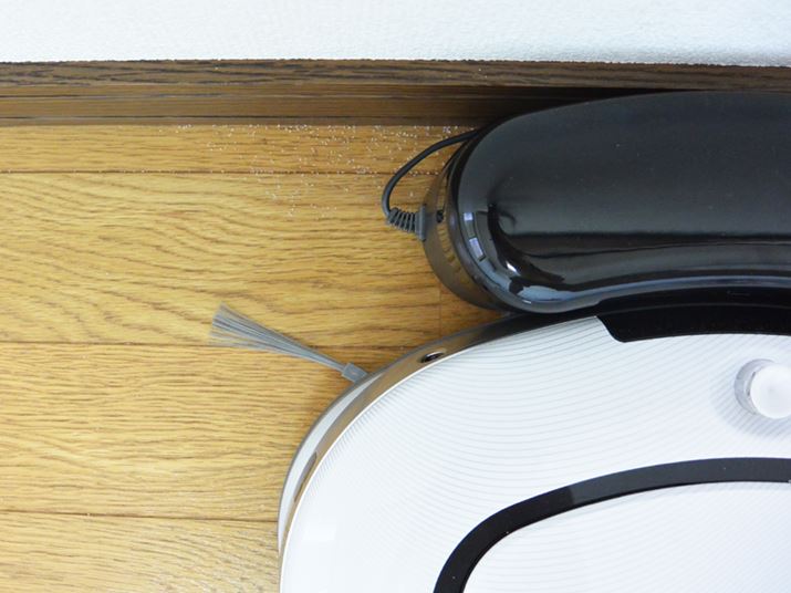 筆者はいろいろなロボット掃除機の集じん性能を検証しているが、砂状のゴミの場合、サイドブラシで周囲に散らばってしまい、汚れが広がってしまうことが多かった。「ルーロ」でも同じ現象が起こるのでは? と心配していたが、コーナーも普通のフローリング部分もザラつきを感じないほどキレイに。部屋の四隅だけでなく、ドアのある凸凹とした所にもゴミの取り残しは見当たらず