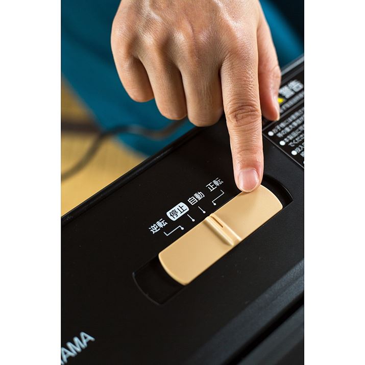 セッティングは至って簡単です。ダストボックスに本体を乗せ、電源プラグを差し込むだけ。操作は本体にある「電源スイッチ」をスライドさせて選択します。といっても、選択するのは、基本操作となる「自動」「停止」と、紙詰まりの時に対応する「逆転」「正転」の4つだけ。禁止事項を守って正しく使っていれば、「逆転」「正転」の出番はほとんどなさそうです。